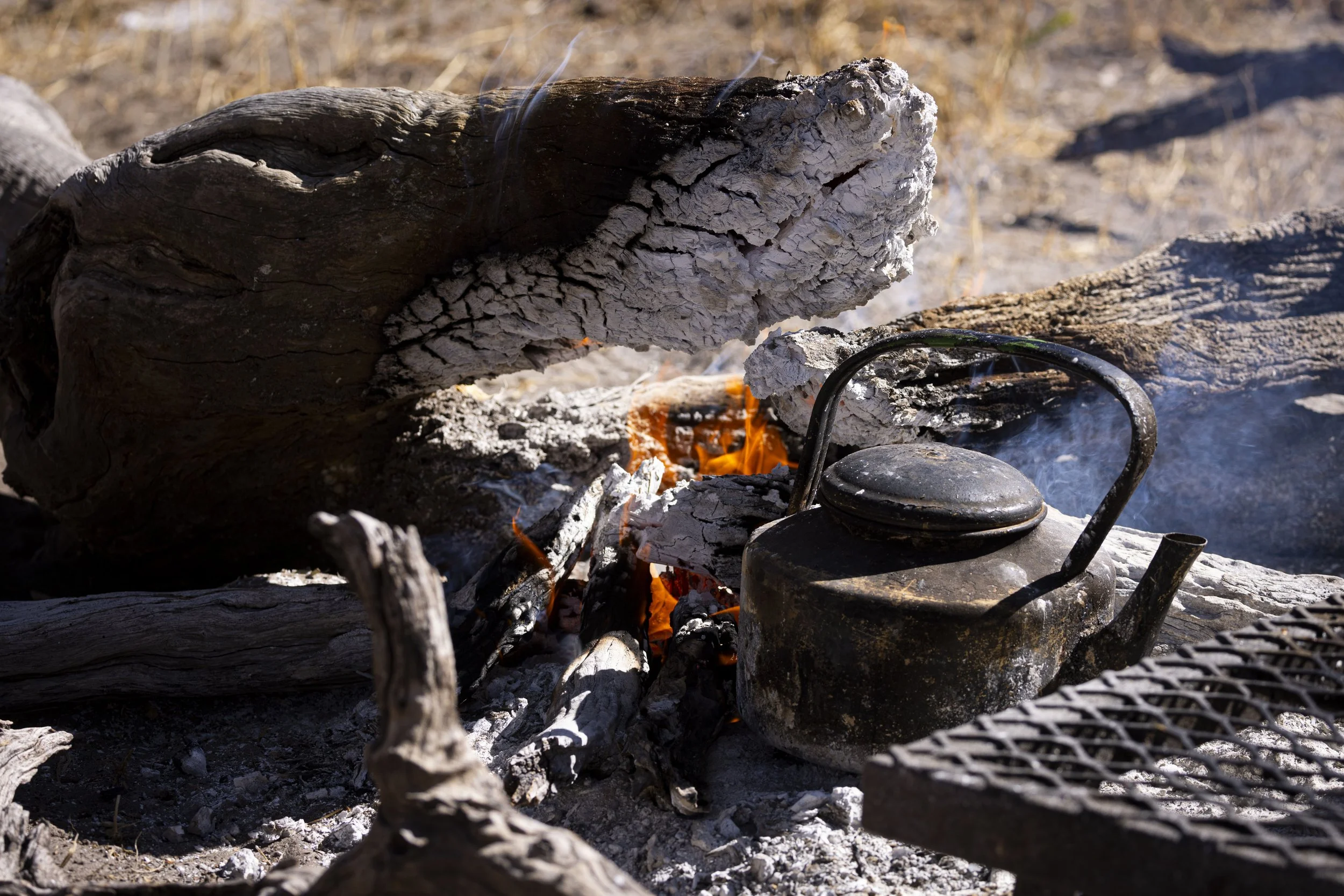 A kettle boiling on an bush camp fire during a wilderness trail safari.